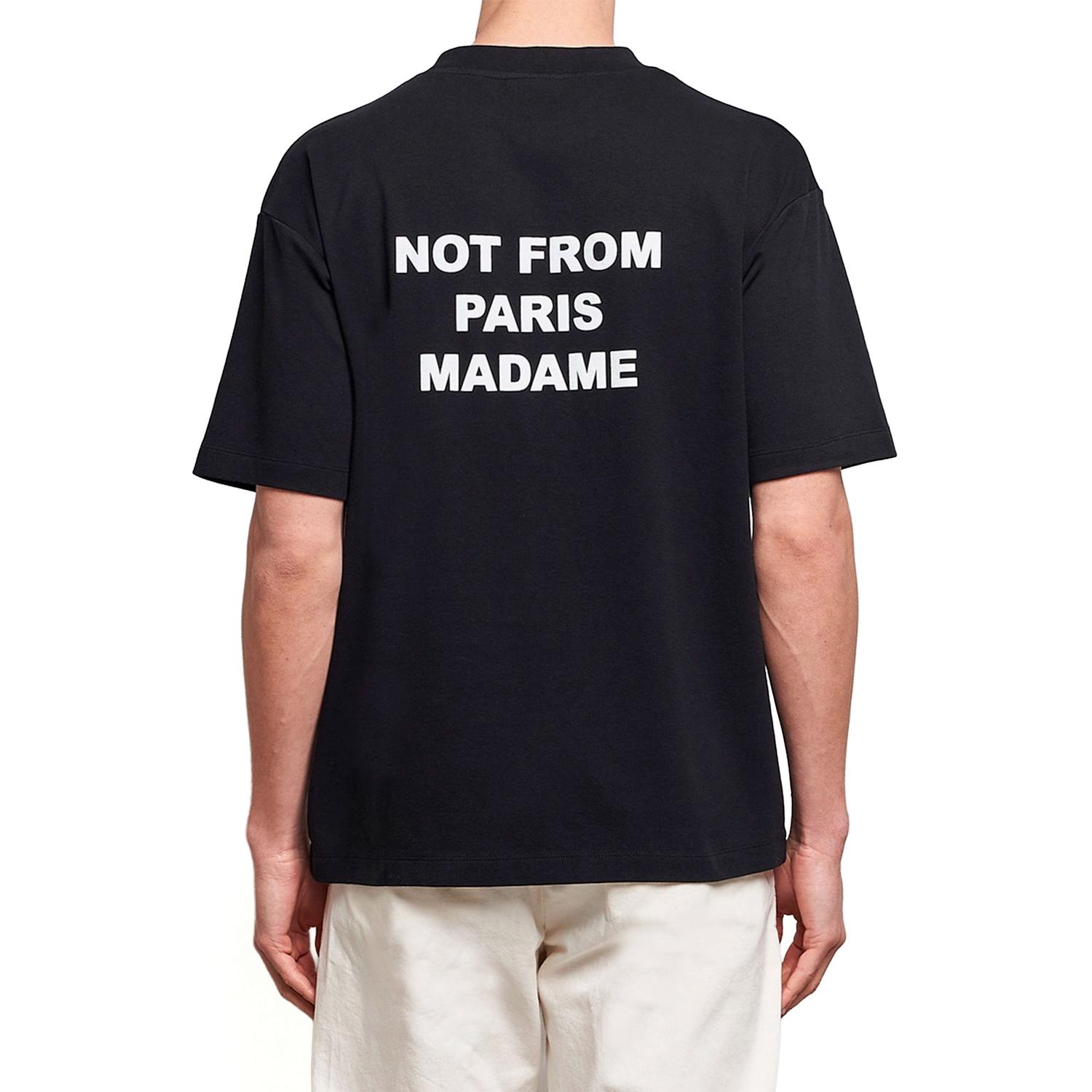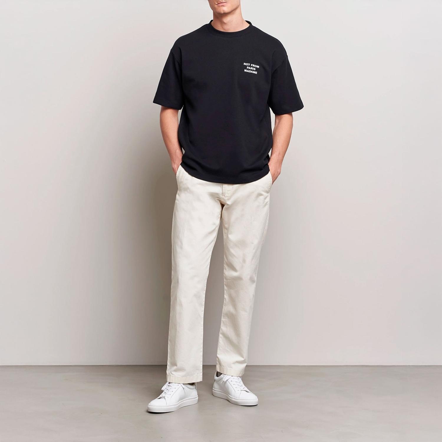 La camiseta Drôle de Monsieur Le T-Shirt Slogan está hecha de 100 % algodón interlock (240 GSM) con cuello acanalado y corte relaxed fit para comodidad diaria. Luce el icónico slogan “Not from Paris Madame” impreso al frente y en la espalda, aportando un toque urbano contemporáneo. Un básico versátil que combina con cualquier outfit casual.
