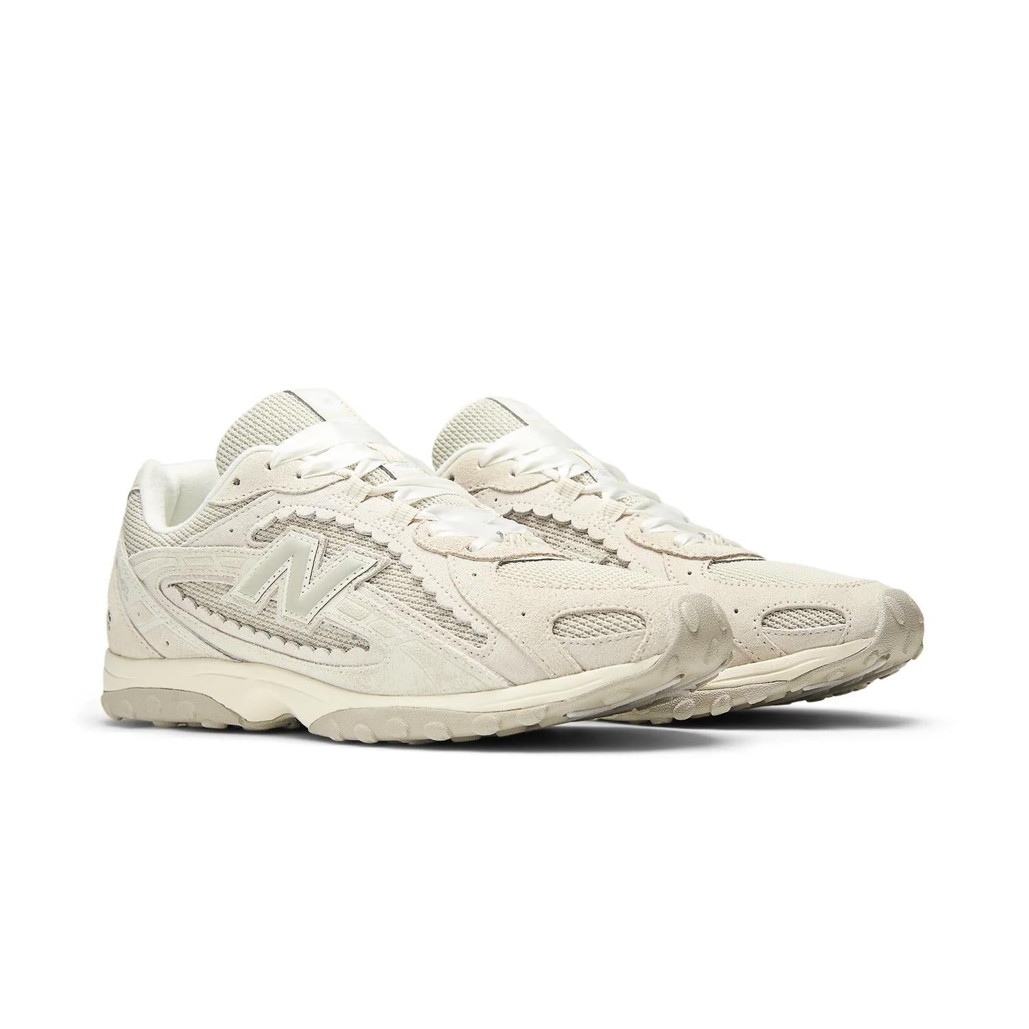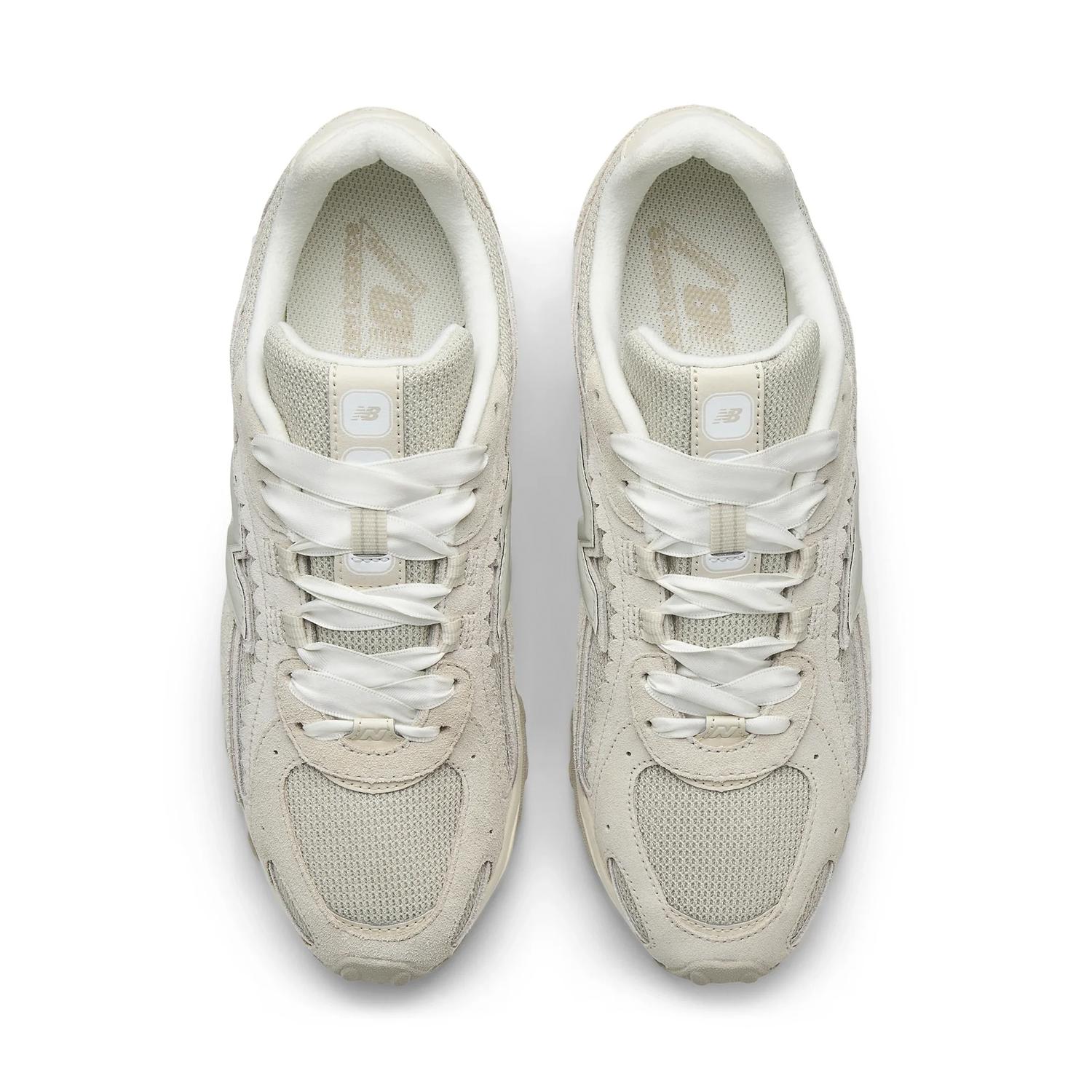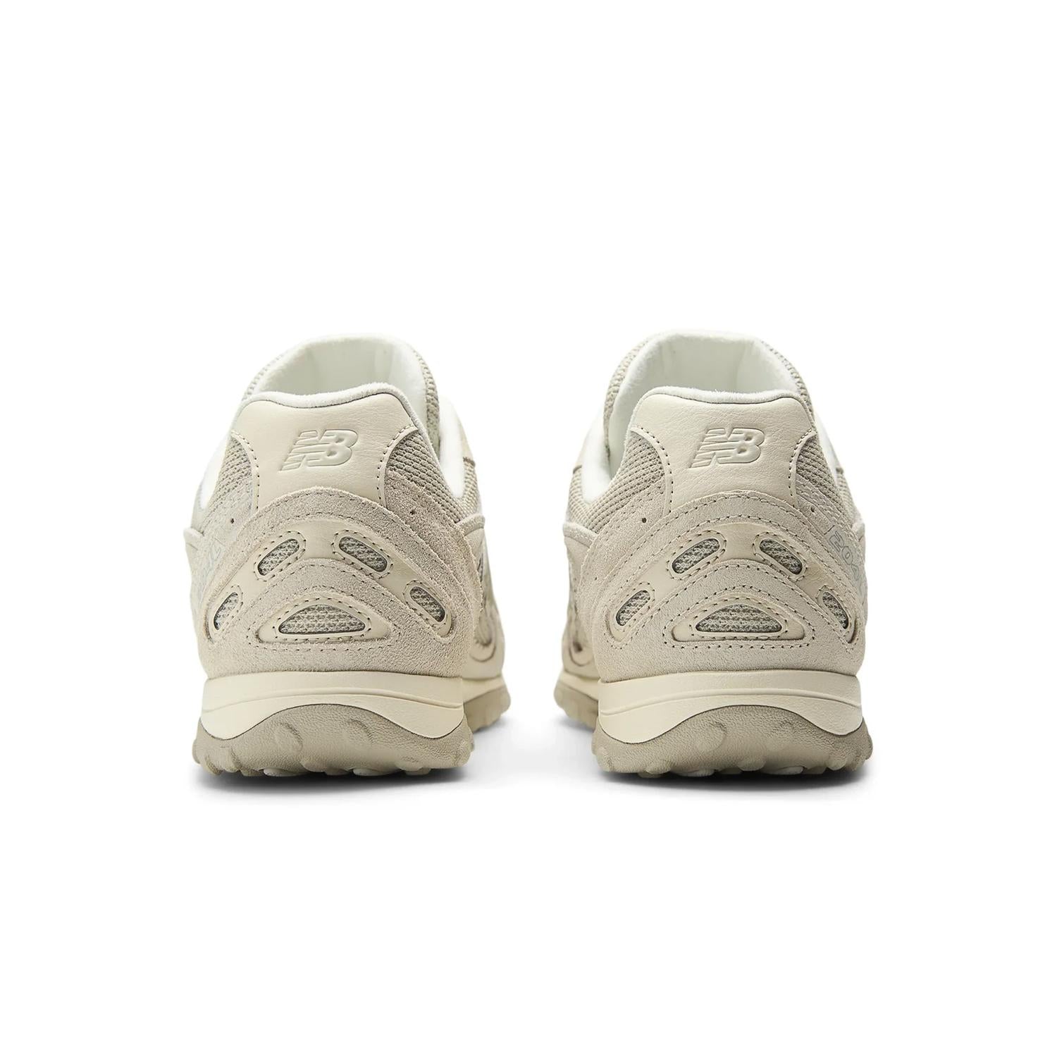 Su upper combina gamuza premium y malla en tonos neutros “Sea Salt” y “Linen”, aportando un acabado elegante y fácil de combinar. Incorpora detalles distintivos como paneles ondulados, acabados festoneados y agujetas tipo cinta que elevan el diseño con un toque sofisticado y femenino.